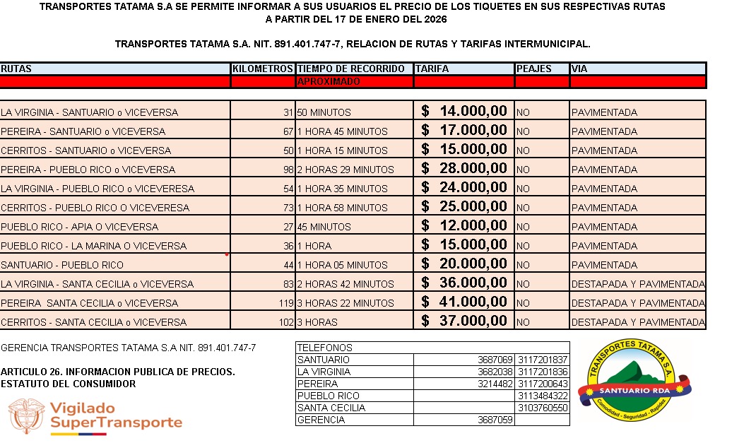 Conozca las tarifas y nuestro contrato de transporte para la prestación y control del servicio de Transportes Tatamá S.A. realice un click en los siguientes botones.